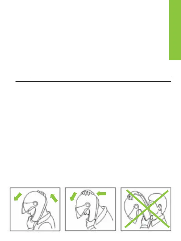 - de helm mag niet draaien, vrij over het hoofd bewegen of afgaan. Indien dit wel het
