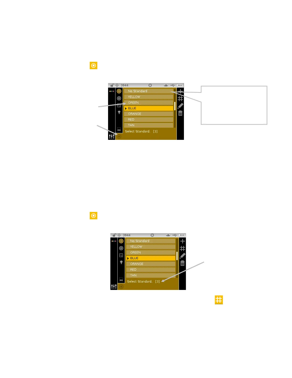 4. Use the Up or Down navigation buttons to move the highlight focus to the desired standard.
