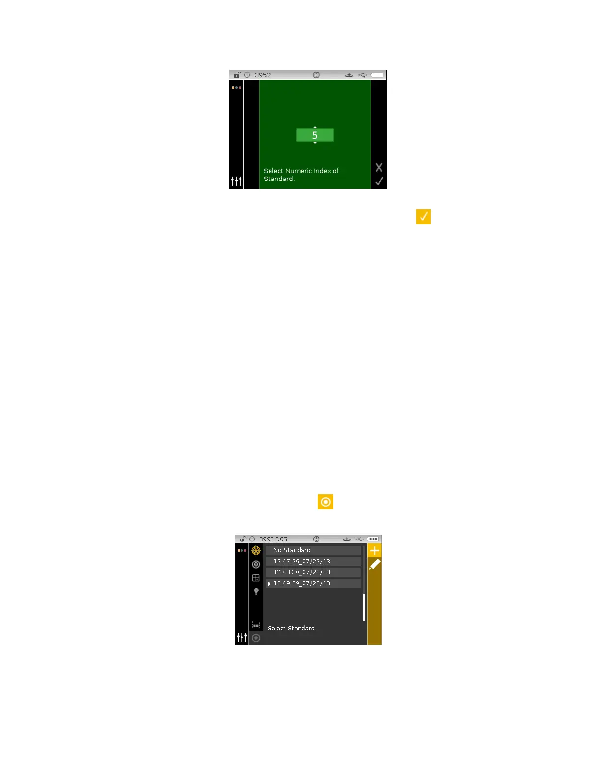 8. Tap the Select button to save the selected standard and return to the measure screen.