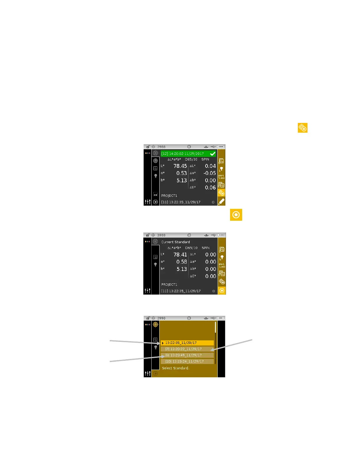 the measurement screen with the selected standard active.
