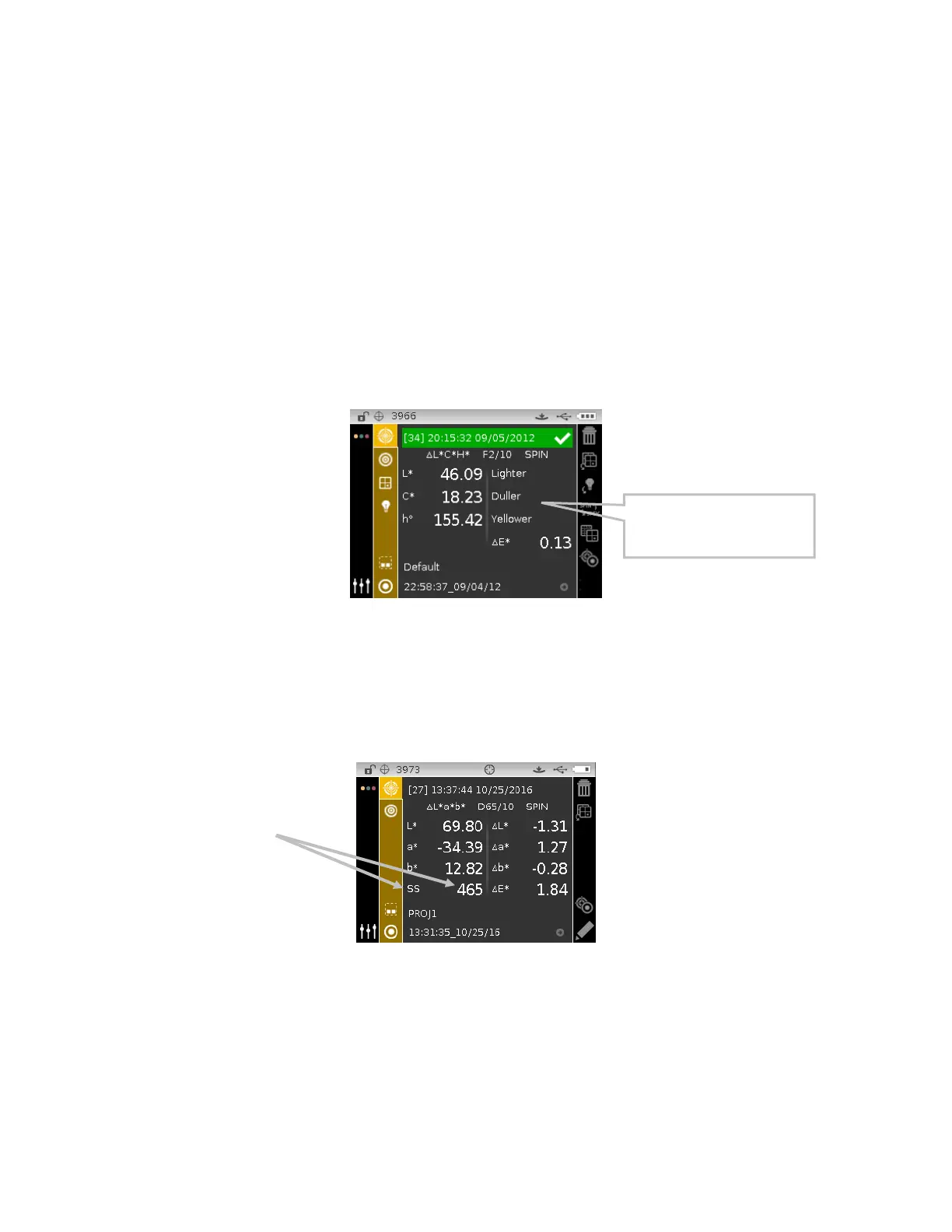 The instrument can display color differences numerically (default setting) or as a verbal
