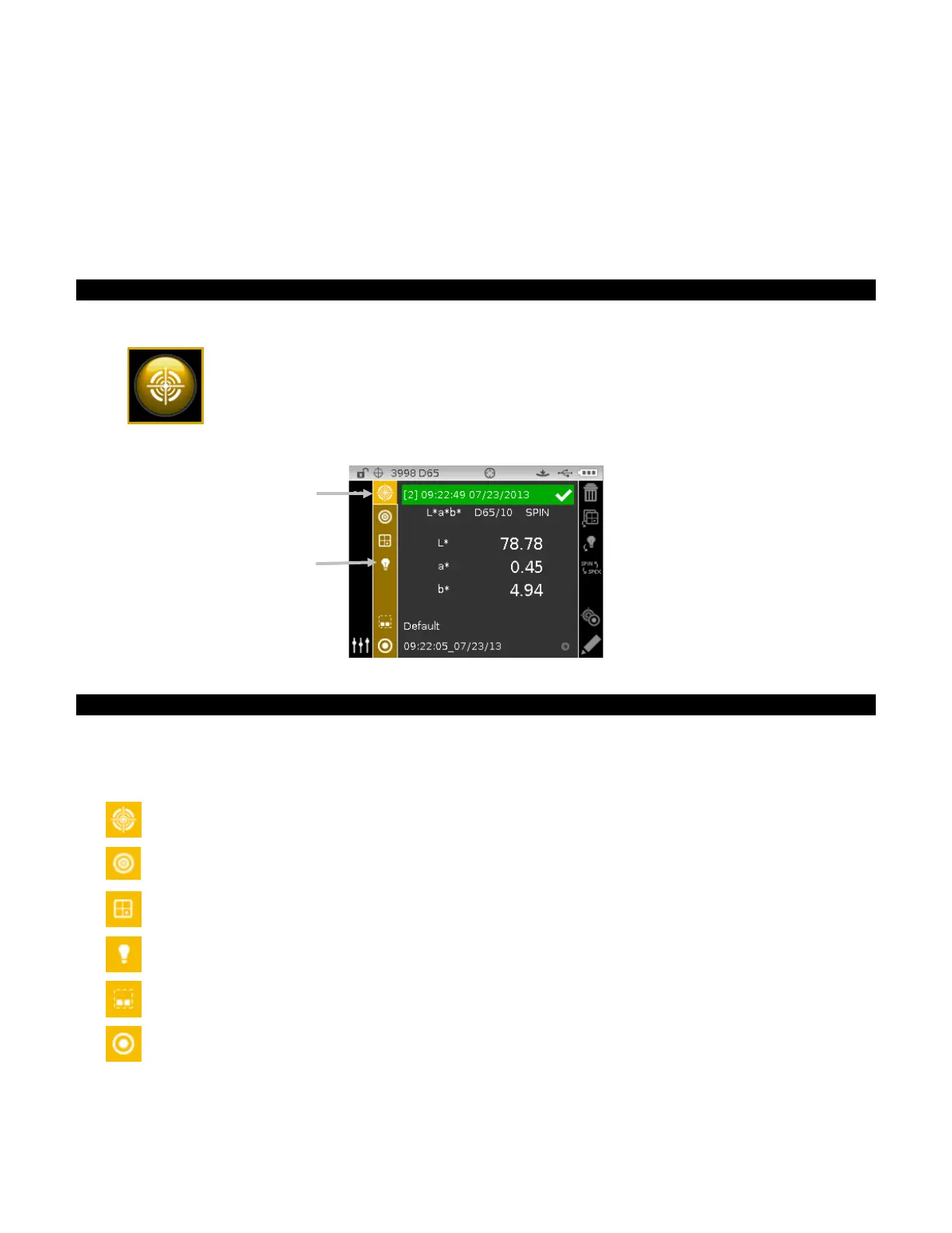 Access illuminant/observer selection screen. Arrow points to current illum/obs