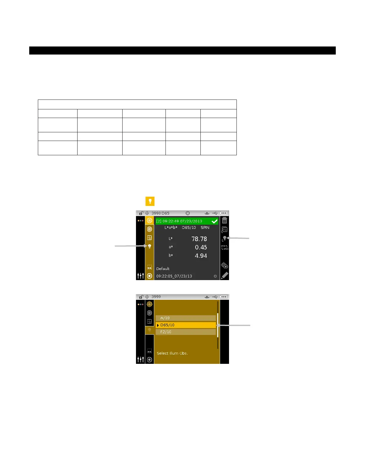 2. Tap the Select or Right navigation button to access the illuminant/observer selection area.