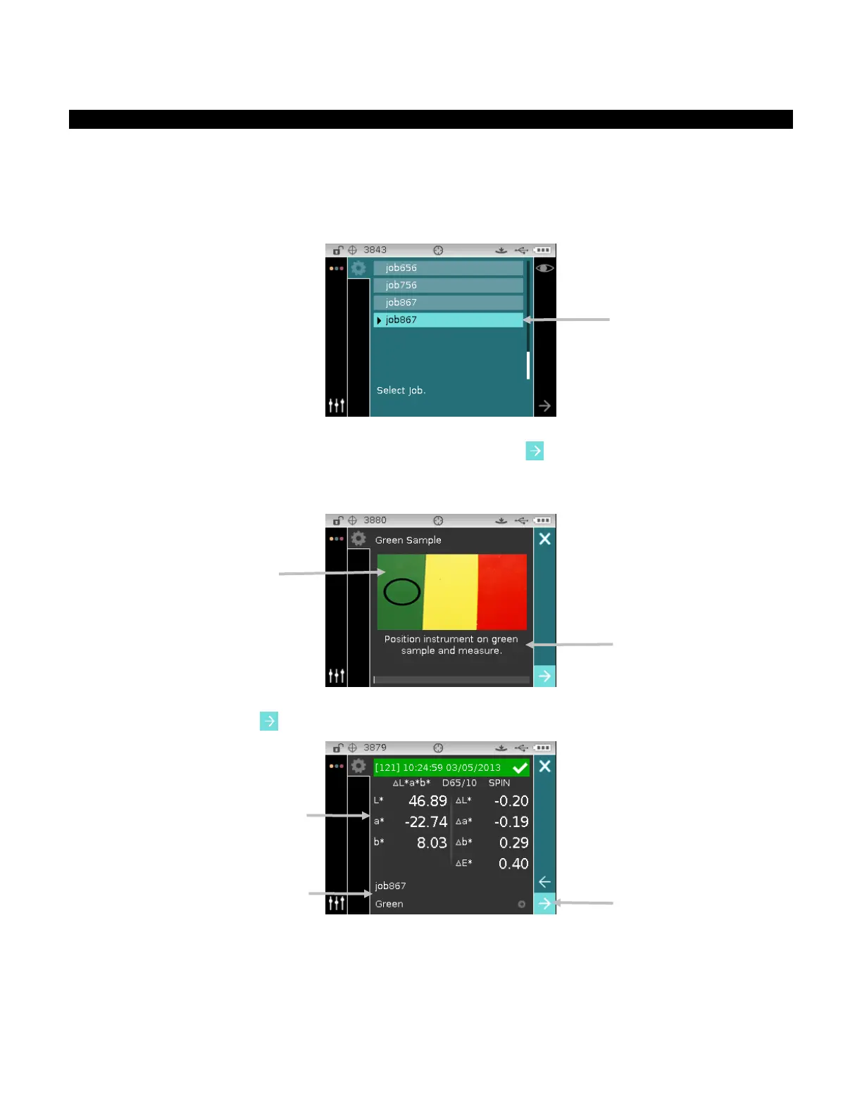 The following sample job downloaded from Color iQC consists of three measurement steps.