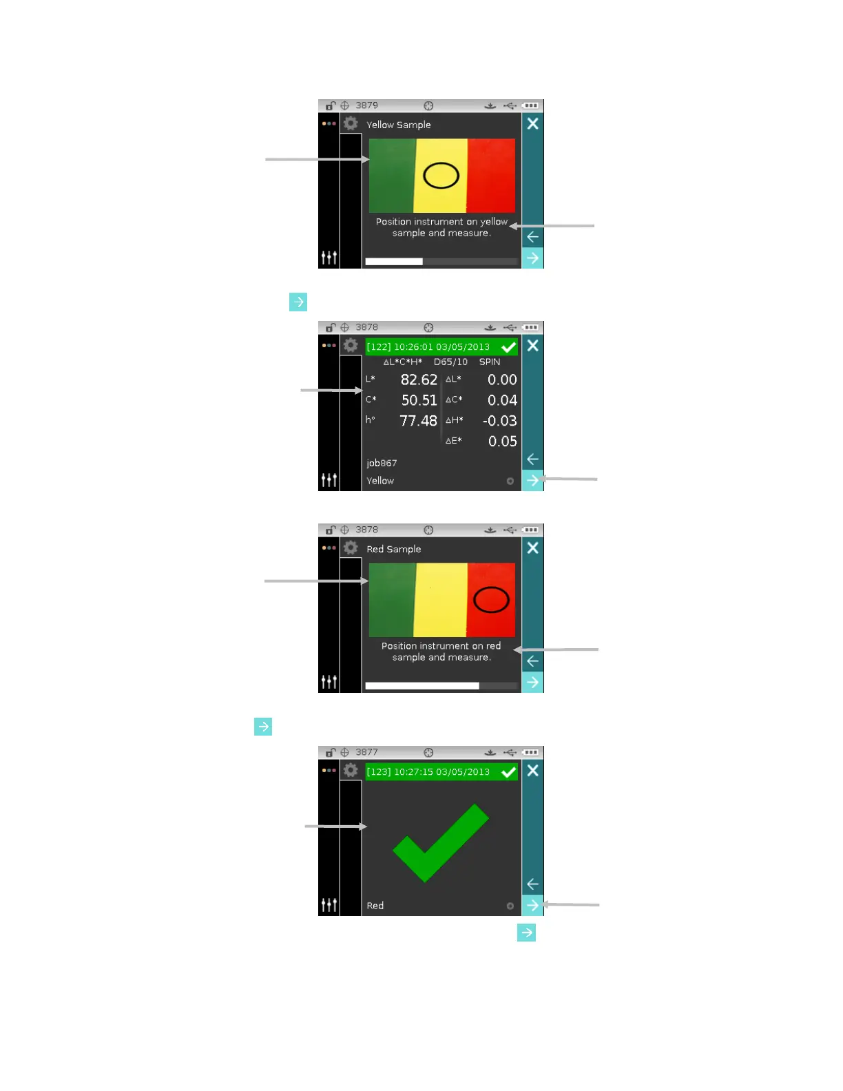 8. Data for the third measurement appears on the display in the color space selected. Make sure