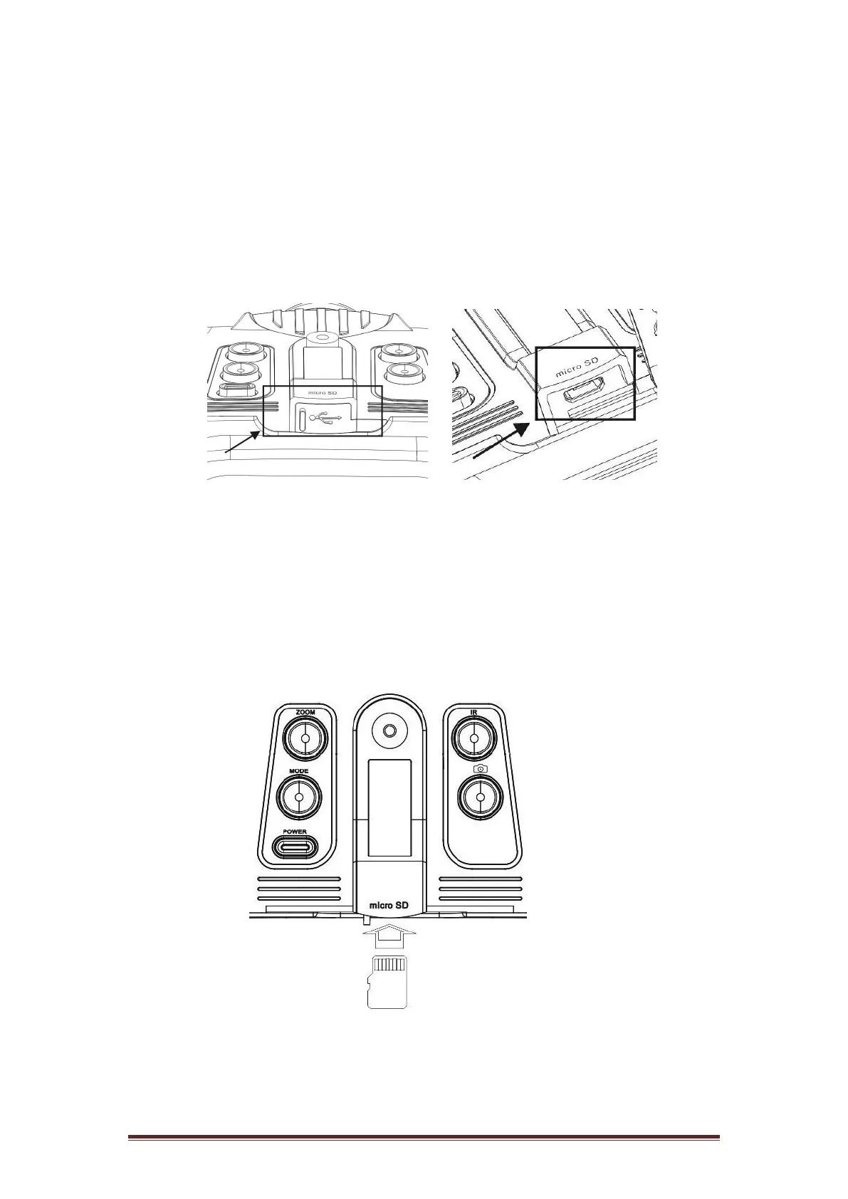 ● Insert a Micro SD card for photo and video taking (not included)