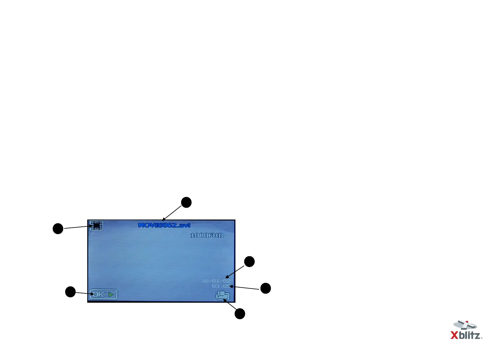 blinking red dot in the upper left corner of the display or by the blue diode on the left side of the screen. The recording time is shown in