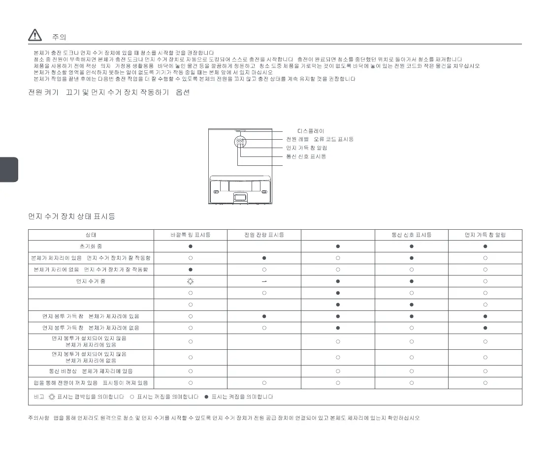 LED 디스플레이에는 남은 전력도 표시됩니다. 먼지 봉투가 설치되지 않은 경우 오류 코드가 표시됩니다. 또한 디스플레이에는 탈취 이온 발생기의 작동, 집진 스테이션 및 호스트의 통신 표시 등 프롬프트 및