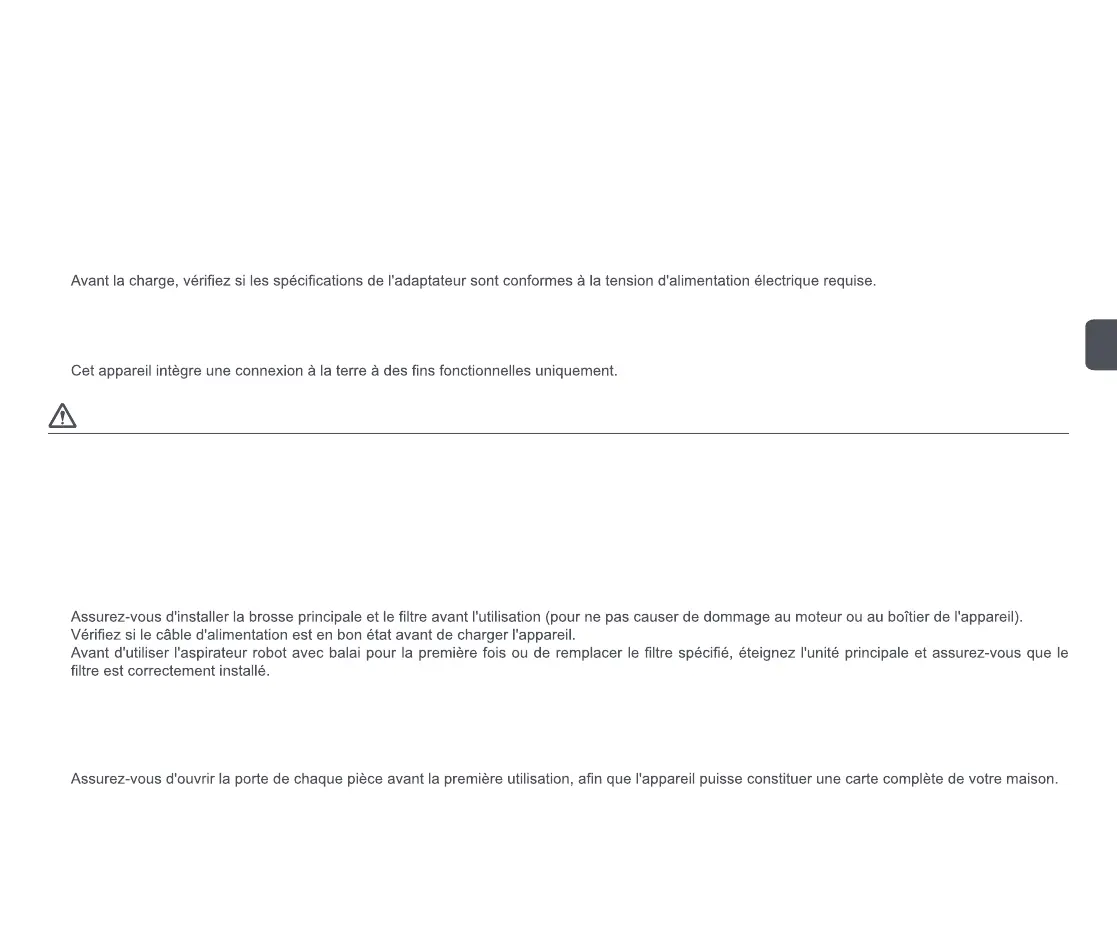 19. Gardez l'aspirateur robot avec balai à distance des équipements électromagnétiques dans les hôpitaux. Cet appareil n'est pas un jouet. Ne laissez