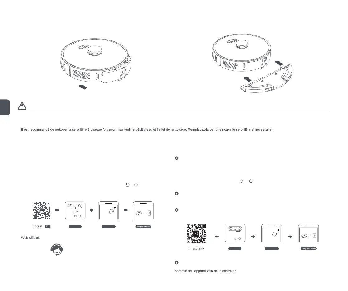 2. Lorsque vous chargez le robot ou lorsque vous ne l’utilisez pas, retirez le module de nettoyage, versez l’excès d’eau contenu dans le réservoir d’eau et nettoyez la serpillière pour éviter les moisissures ou