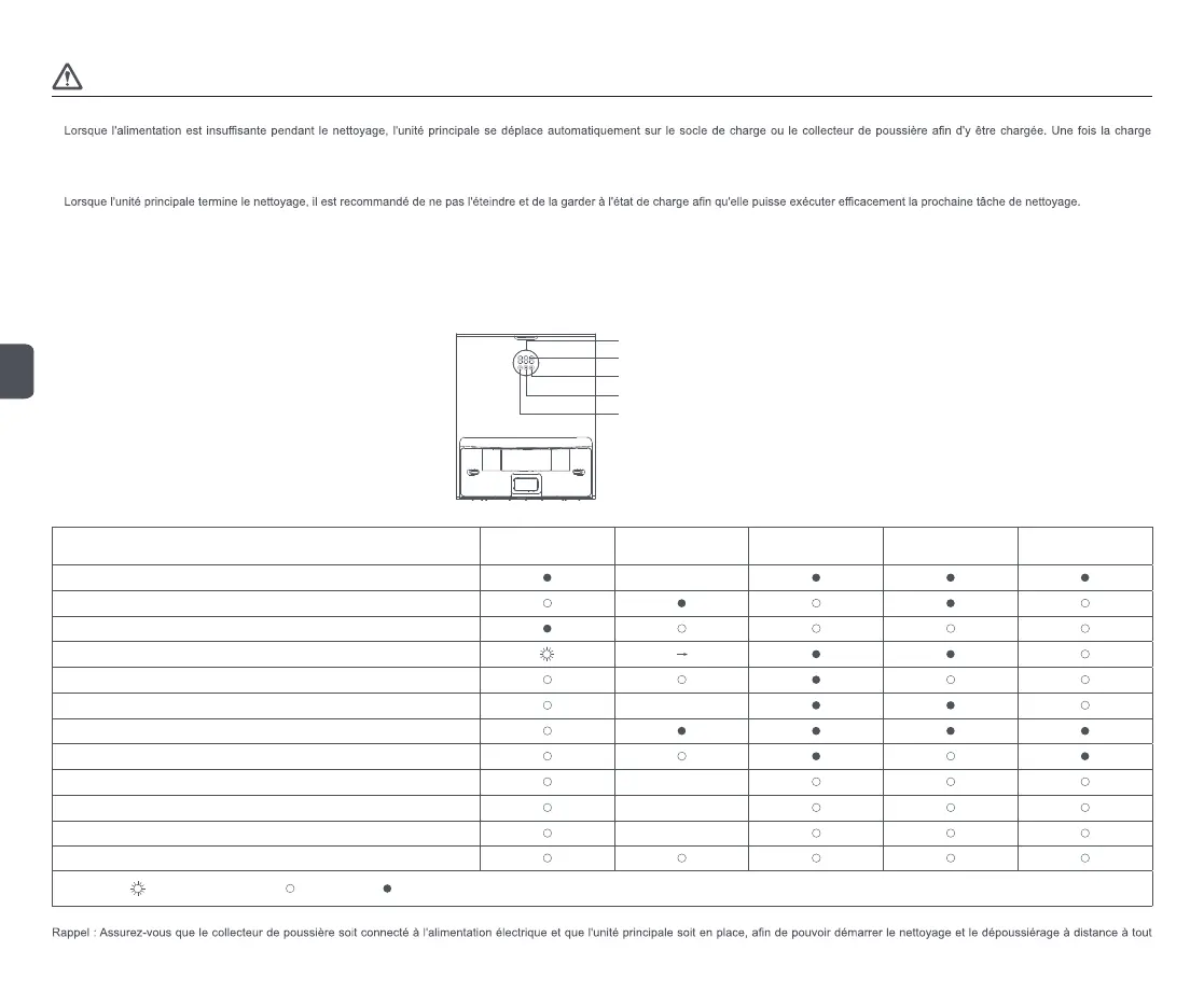Appuyez sur l'écran LED pour activer la fonction de dépoussiérage. Lorsque la fonction de collecte de poussière de la station intégrée est normale, l'indicateur de l'anneau extérieur indique l'état du voyant