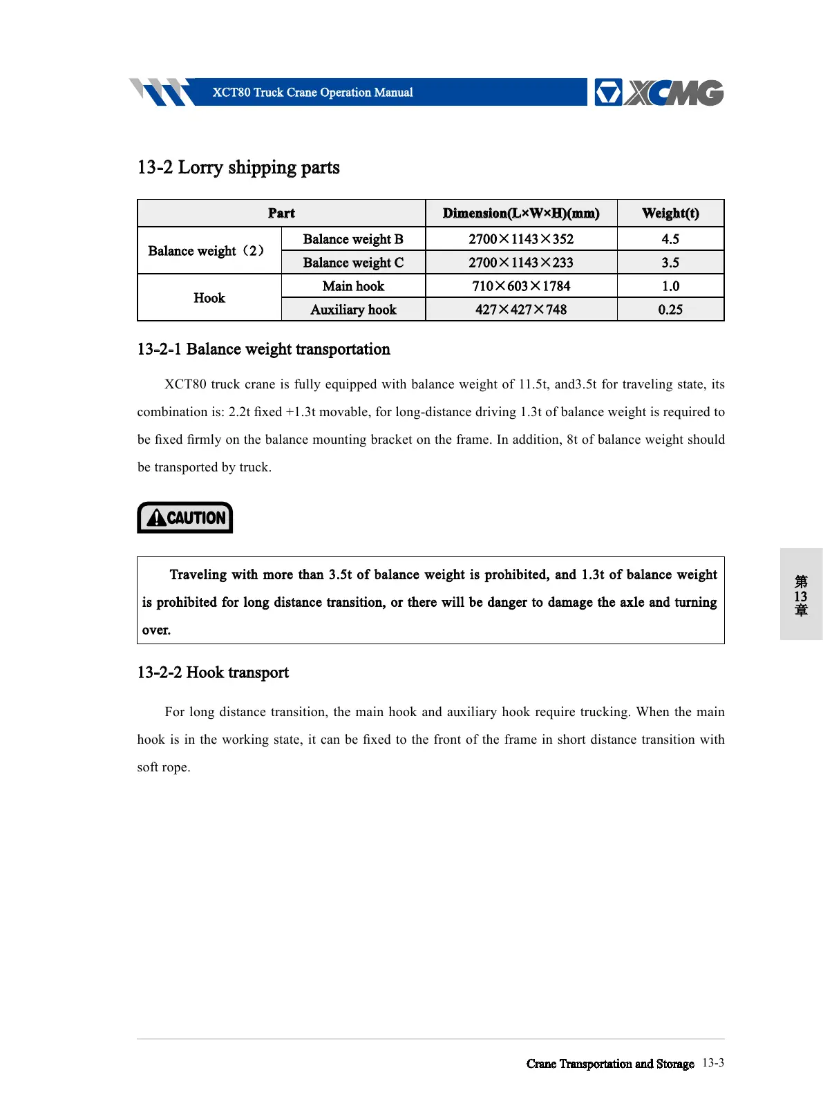 Traveling with more than 3.5t of balance weight is prohibited, and 1.3t of balance weight