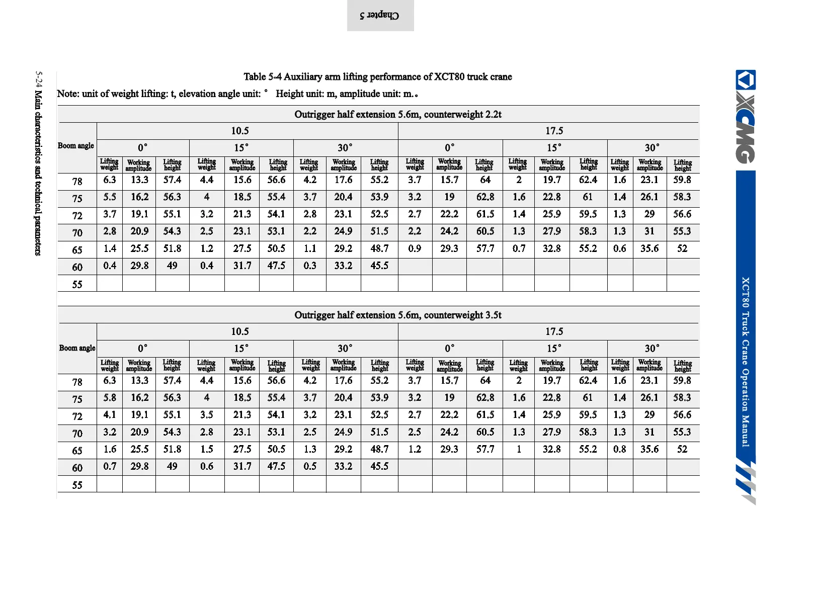 Table 5-4 Auxiliary arm lifting performance of XCT80 truck crane