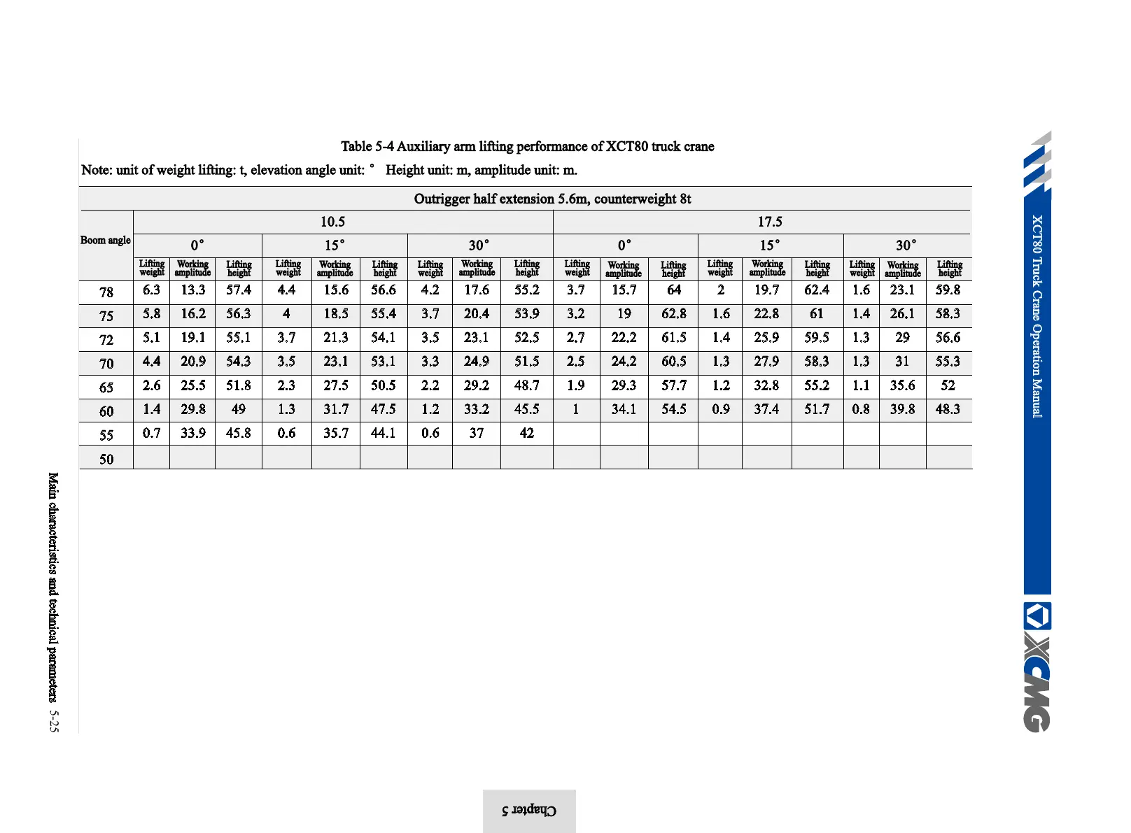 Table 5-4 Auxiliary arm lifting performance of XCT80 truck crane