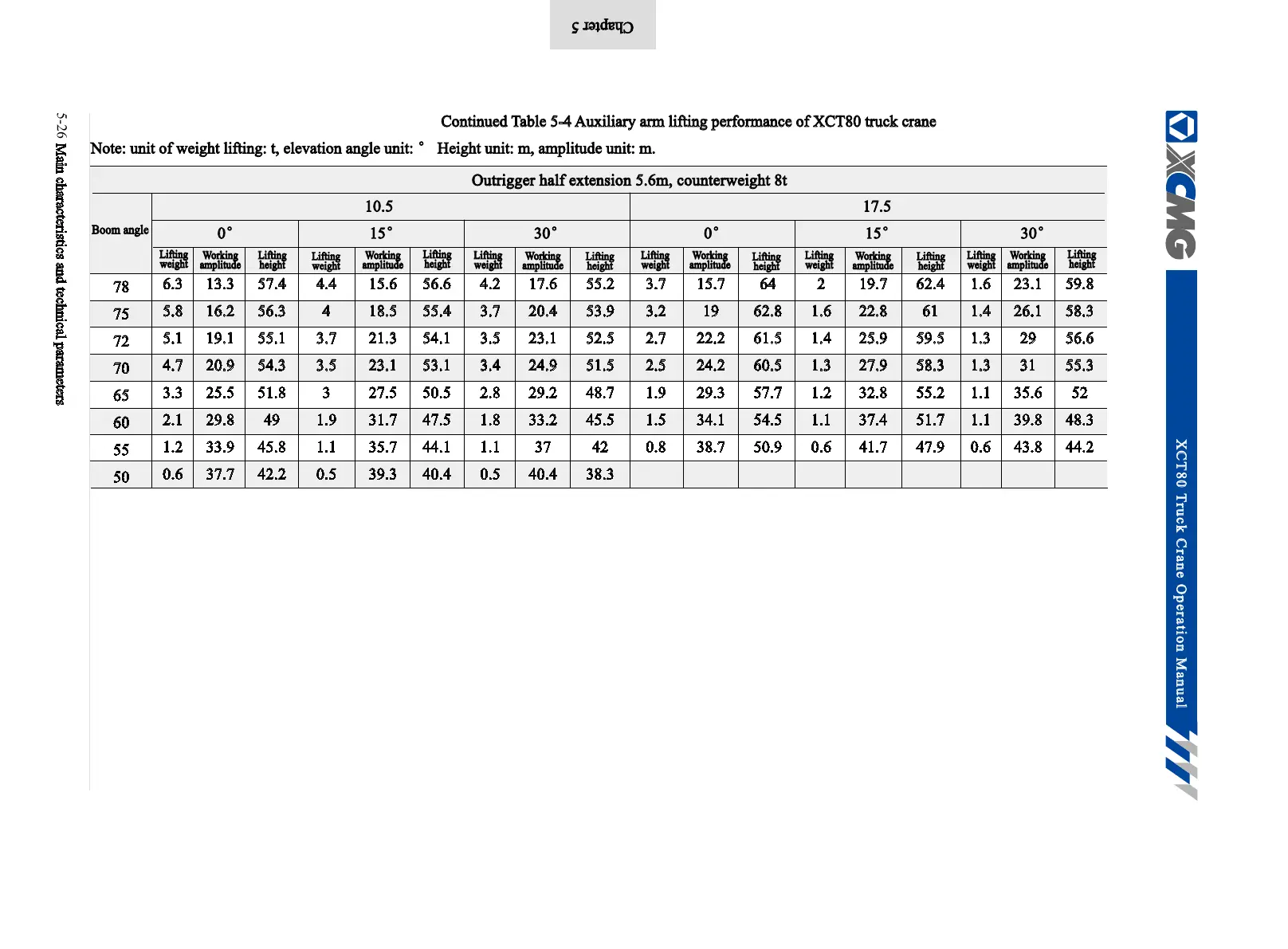 Continued Table 5-4 Auxiliary arm lifting performance of XCT80 truck crane