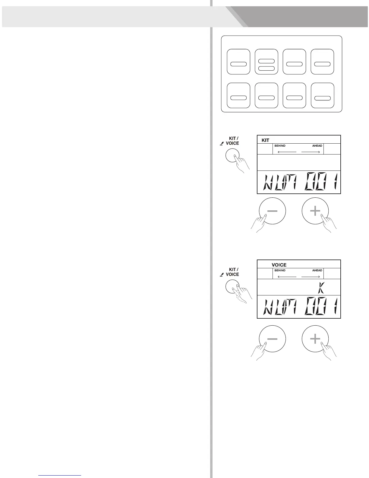 2. Press the [+]/ [-] button to select your desired drum kit. (Refer to
