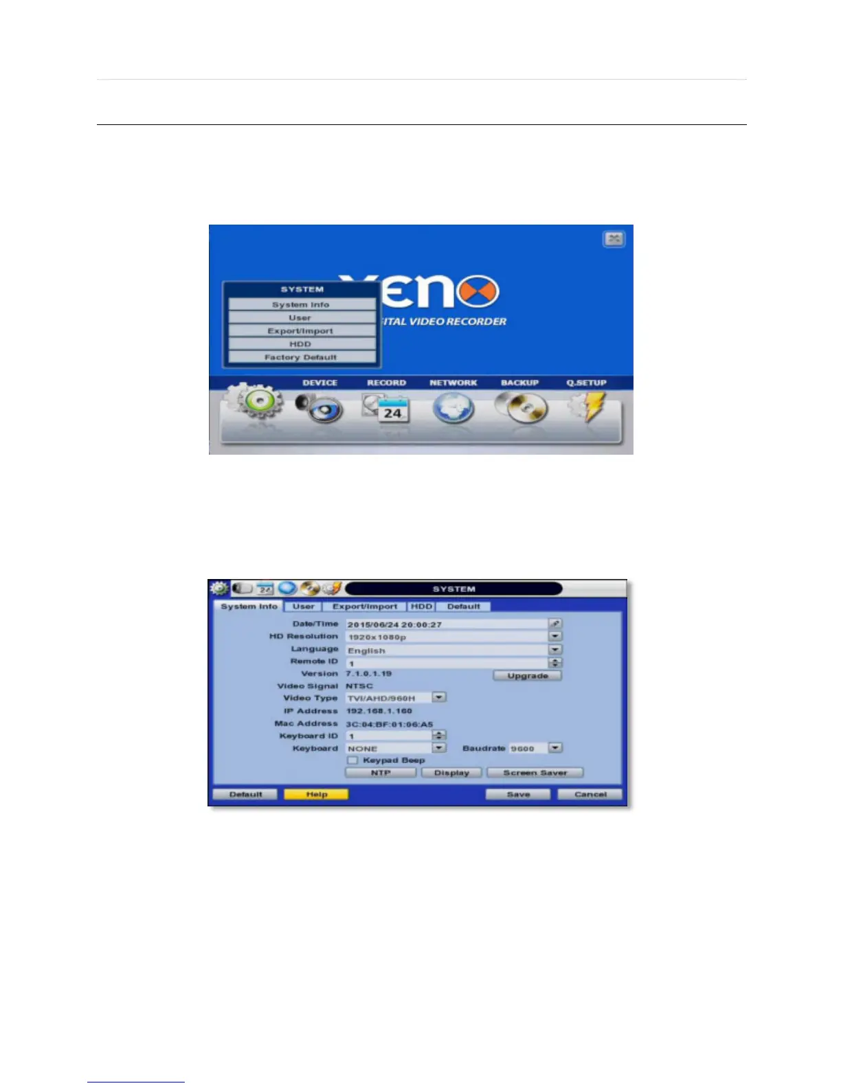 The System Info sub-menu includes the following setup options: Date/ Time, HD Resolution, Language, Remote ID, Version