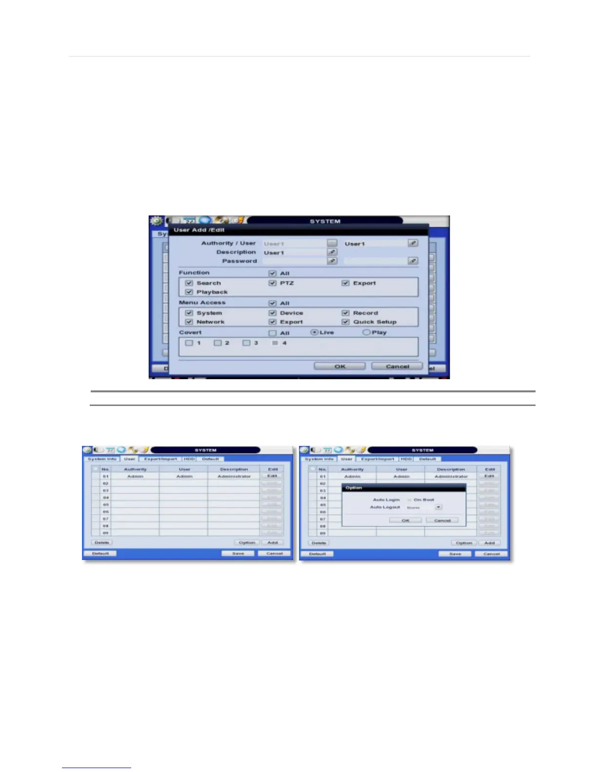 Admin can designate a new user with different permission levels by: functions, menu access, and live & playback.