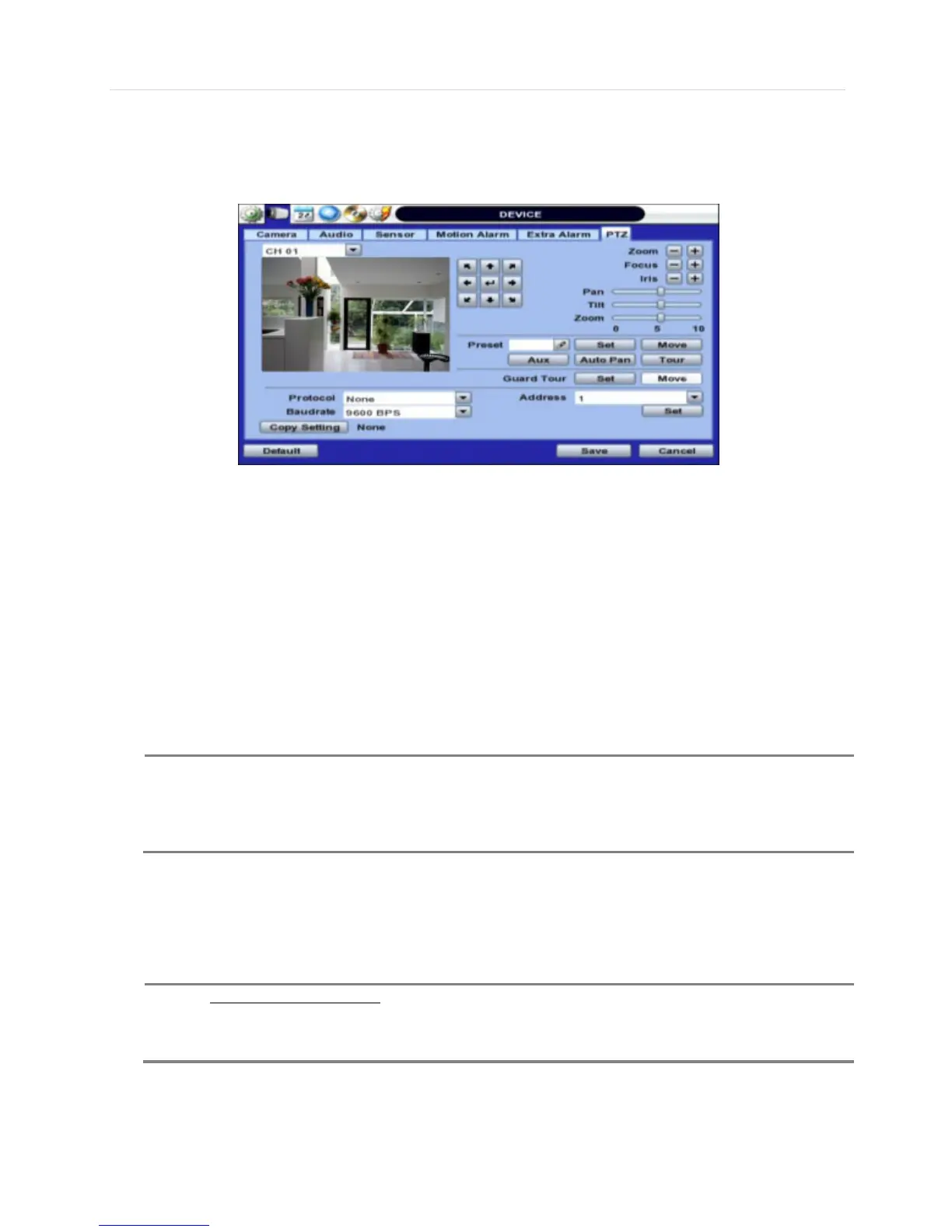 Auto Pan, Aux & Guard Tour- These options allow the DVR to command a PTZ camera to move to a