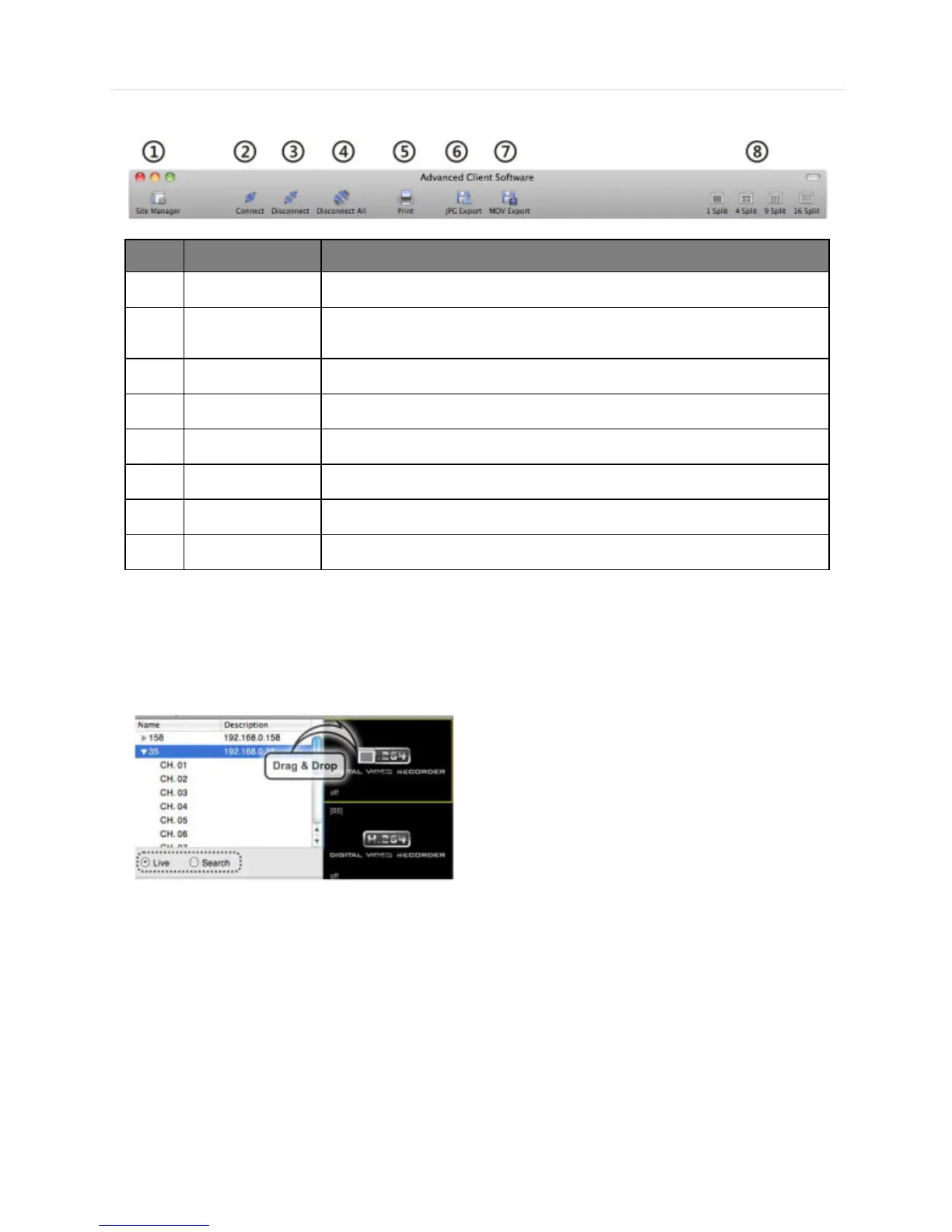 The site list panel shows registered DVR lists. To connect, Drag & Drop the site.