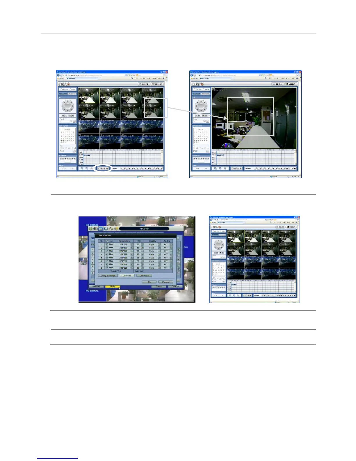 User can monitor live video in 1, 4, 9 or 16 screen modes. If user wants to see single channel in full screen, user can