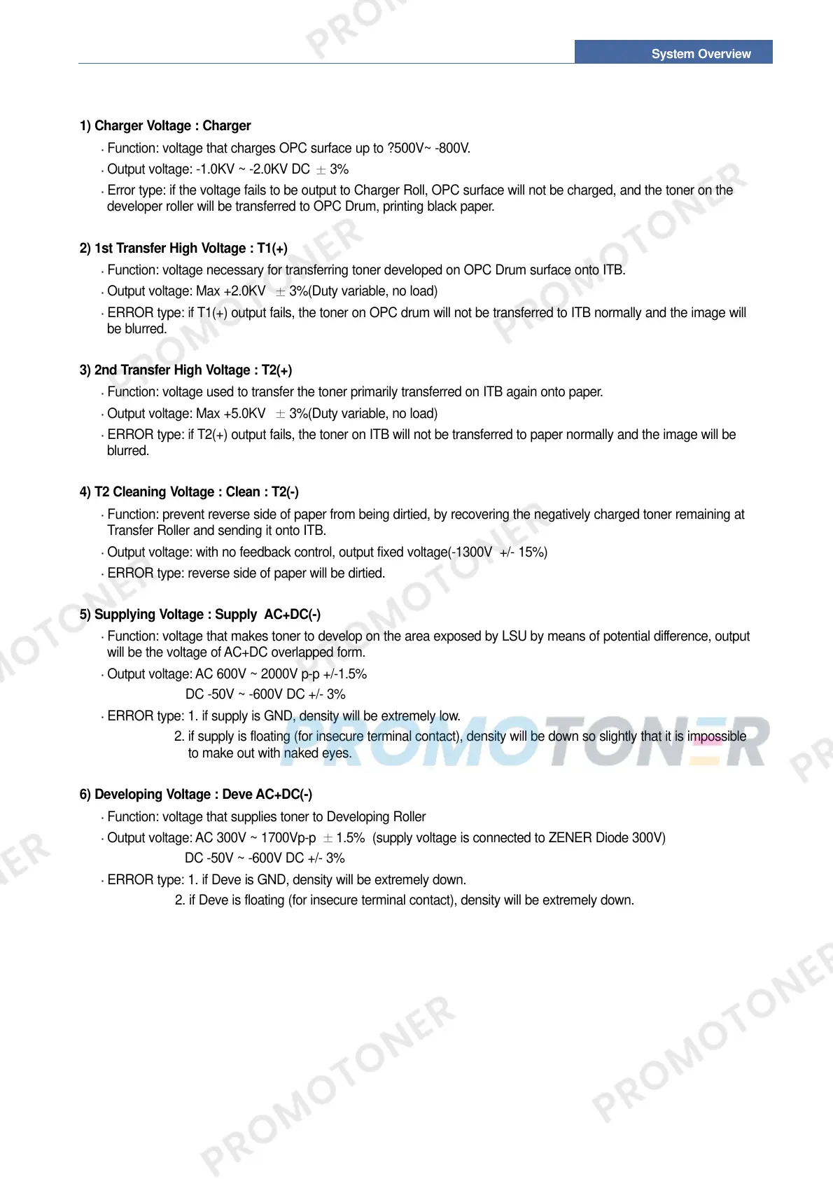 Error type: if the voltage fails to be output to Charger Roll, OPC surface will not be charged, and the toner on the