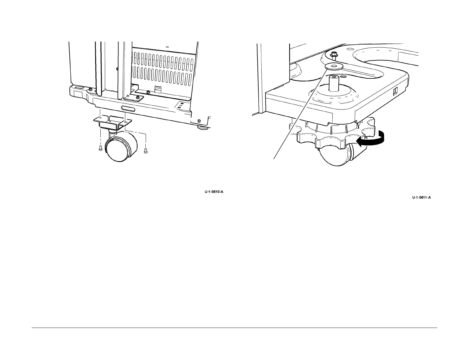 4. Remove the 2 screws and remove the fixed caster, Figure 1.