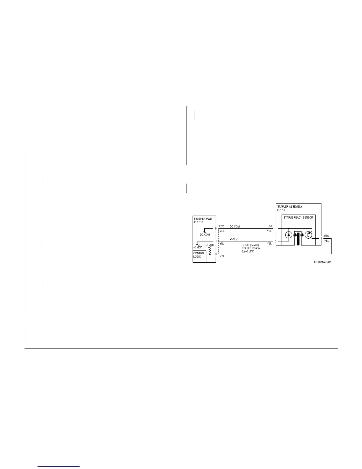 +5 VDC is measured between the Stapler Assembly p/j (+) and Finisher PWB Chas-