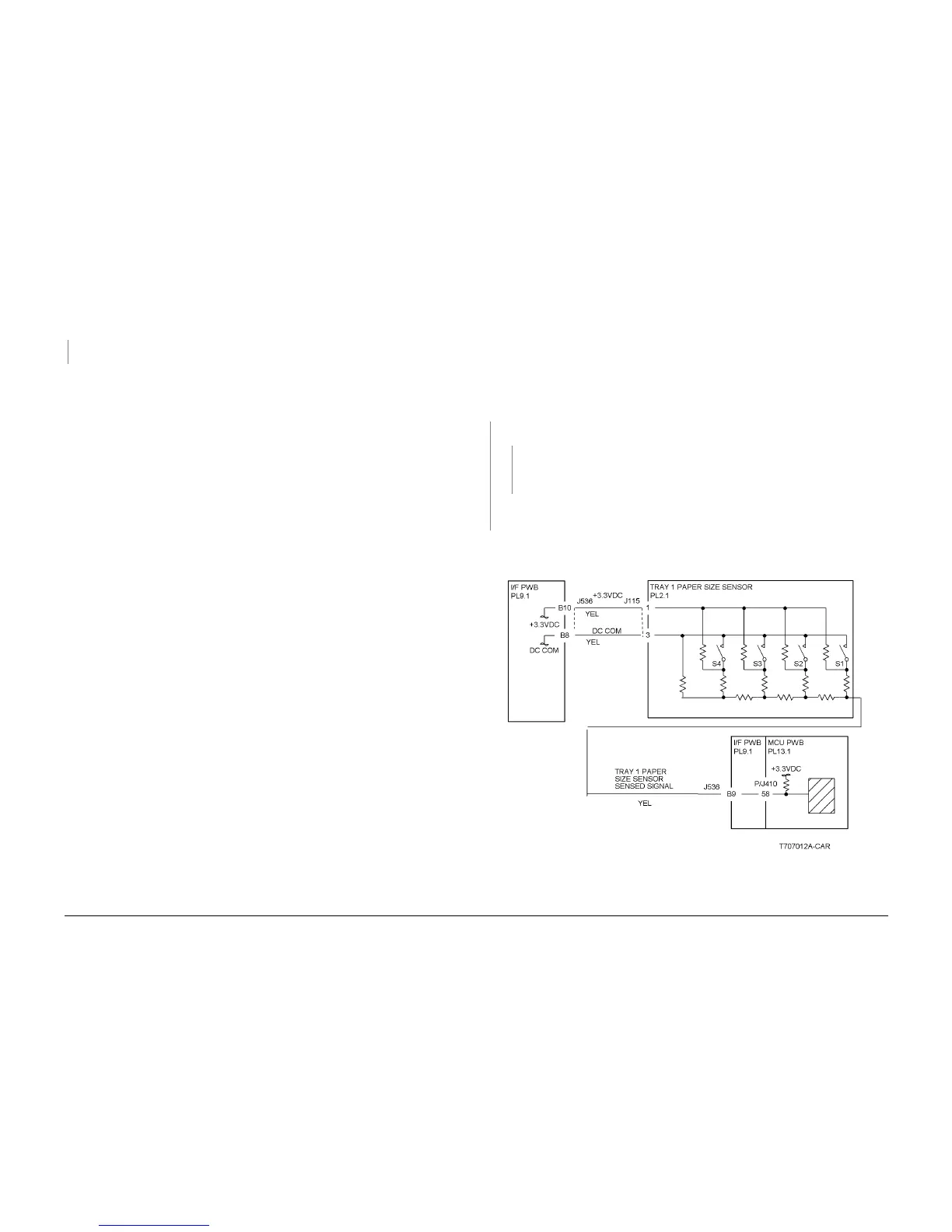 Ensure Tray 1 is closed. The voltage measured at P/J536-B9 on the I/F PWB corresponds