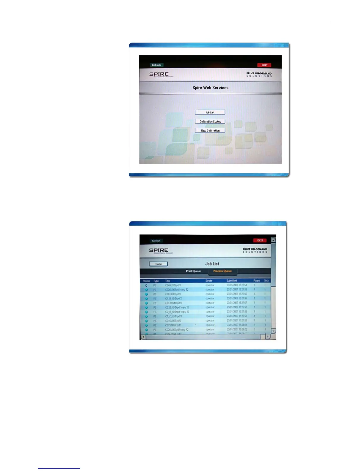 • Touch Process Queue to view jobs in the Spire CX260 Process queue.