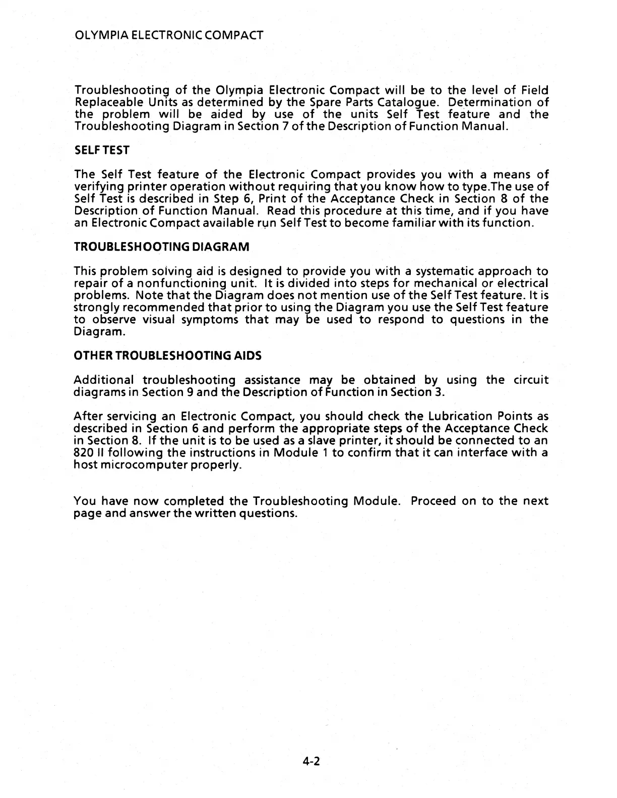 Xerox OLYMPIA ELECTRONIC COMPACT - Troubleshooting; SELF TEST; TROUBLESHOOTING DIAGRAM; OTHER TROUBLESHOOTING AIDS