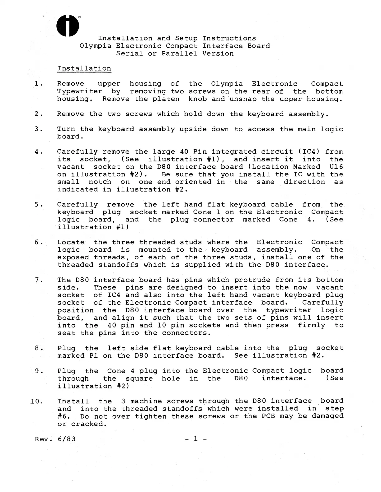 Xerox OLYMPIA ELECTRONIC COMPACT - Installation and Setup Instructions Olympia Electronic Compact Interface Board Serial or Parallel Version