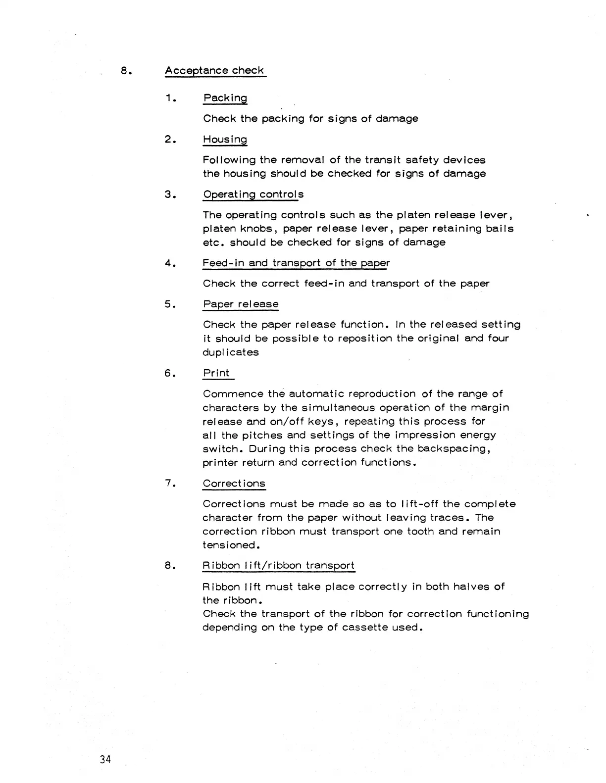 Xerox OLYMPIA ELECTRONIC COMPACT - 8. Acceptance check; 6. Print; 7. Corrections; 8. Ribbon lift;ribbon transport