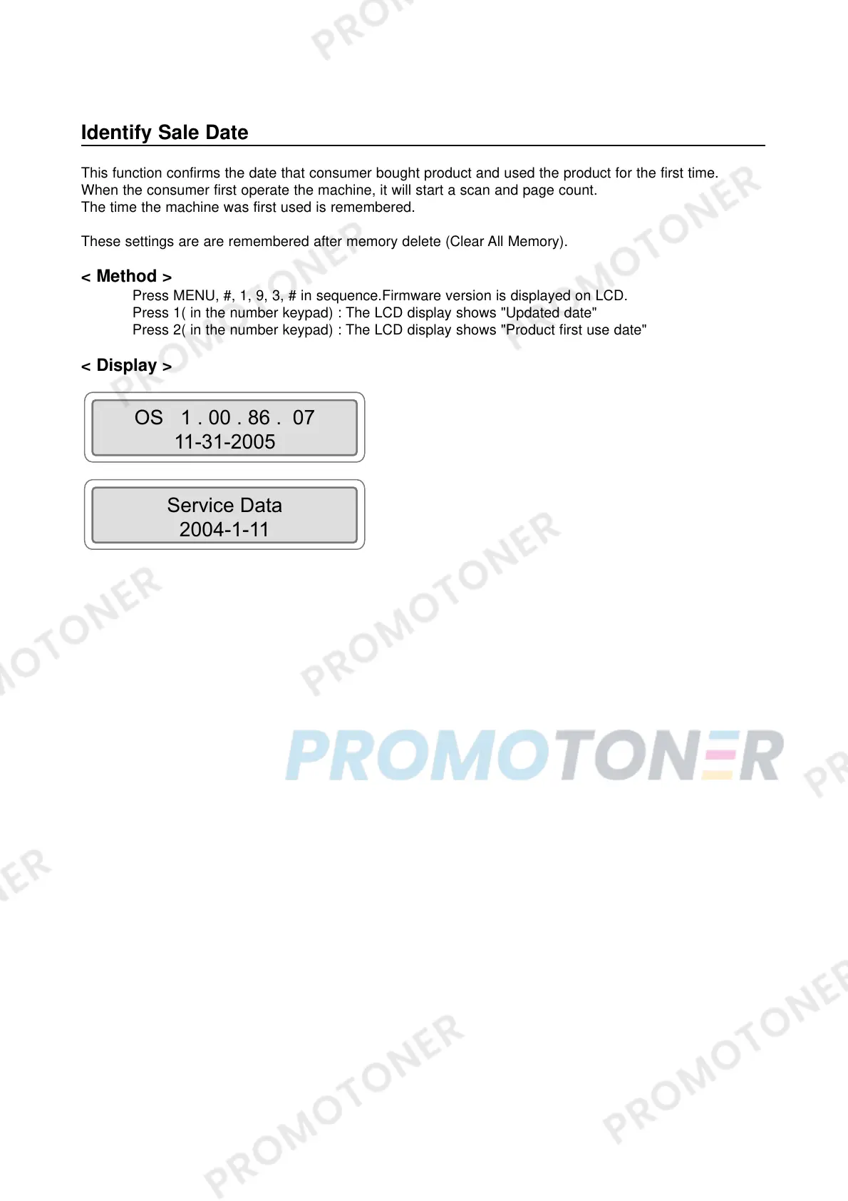 Press 2( in the number keypad) : The LCD display shows "Product first use date"