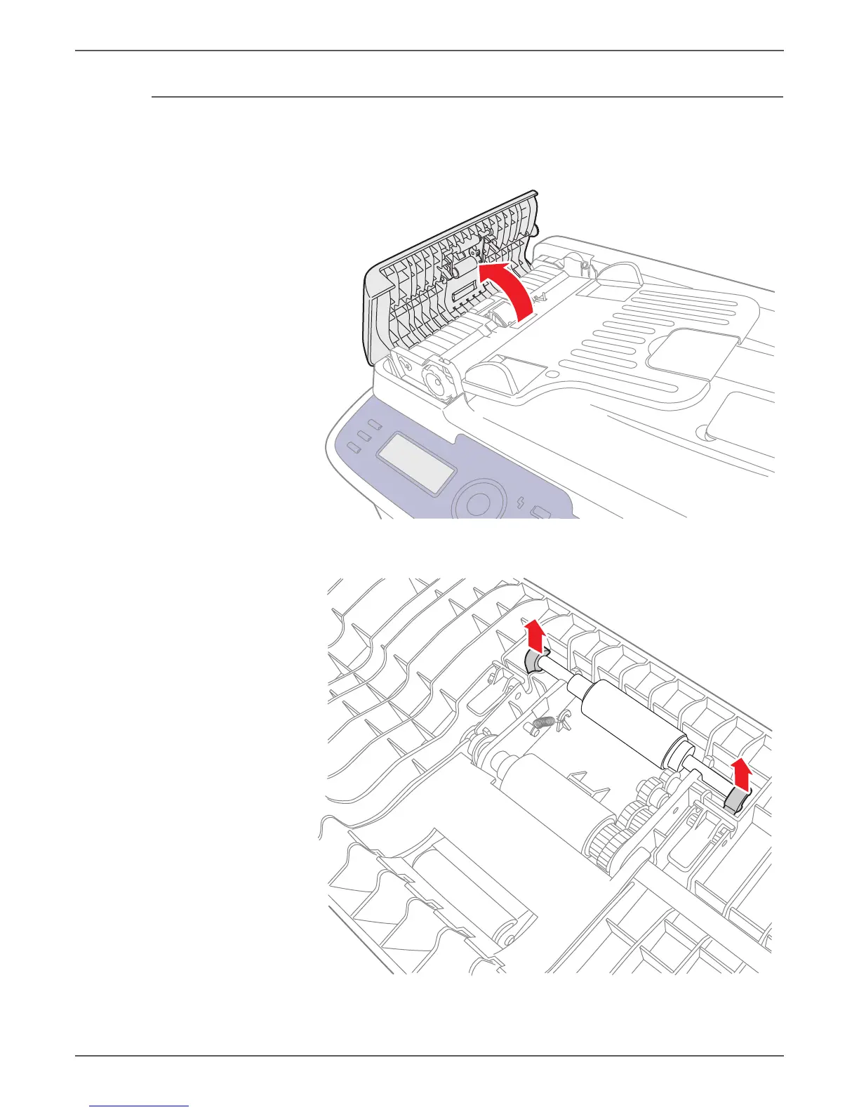 2. Unsnap the 2 clips on the ADF Pick-up Roller shaft.