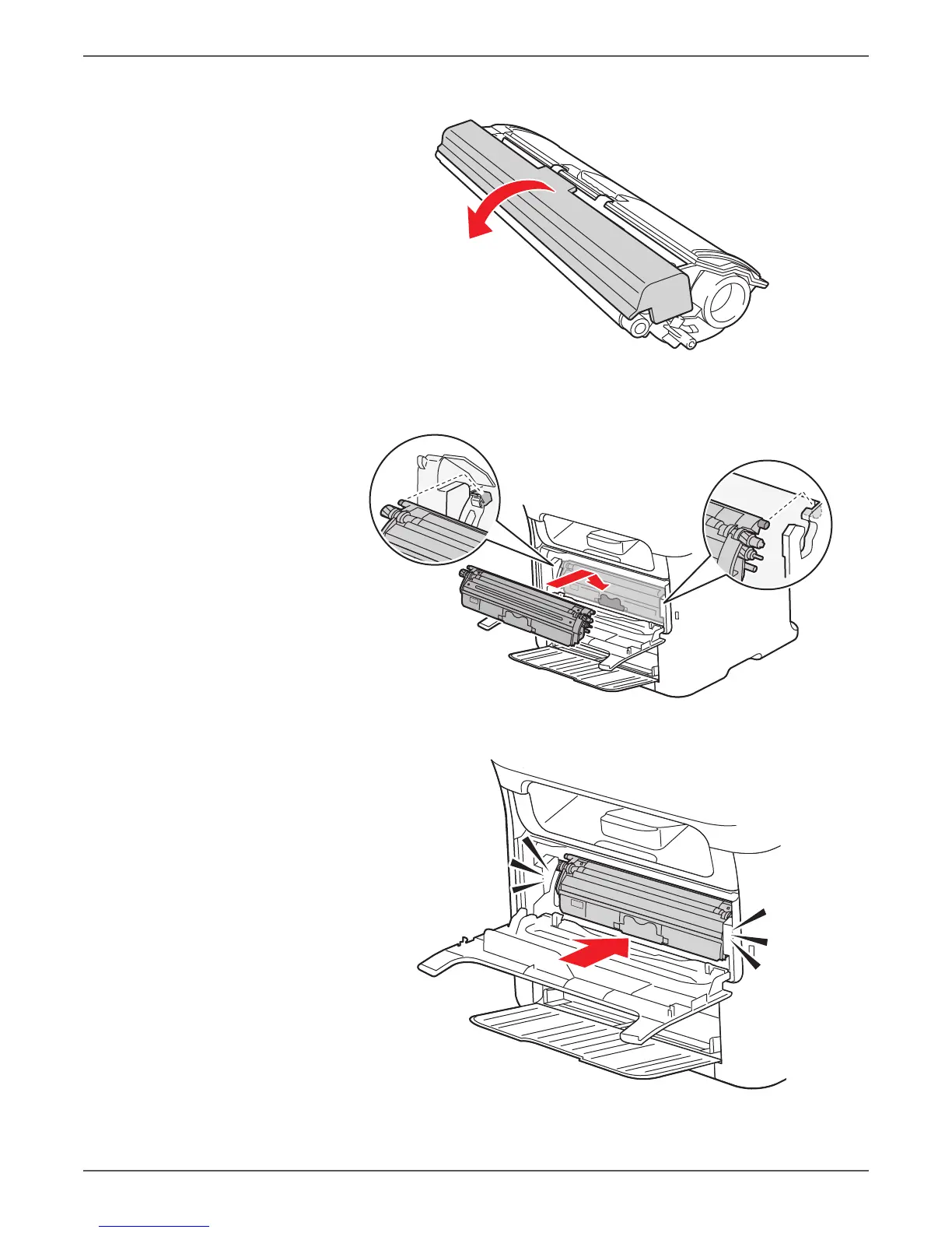 6. Aligning the shaft on both sides of the Toner Cartridge with the rails in the