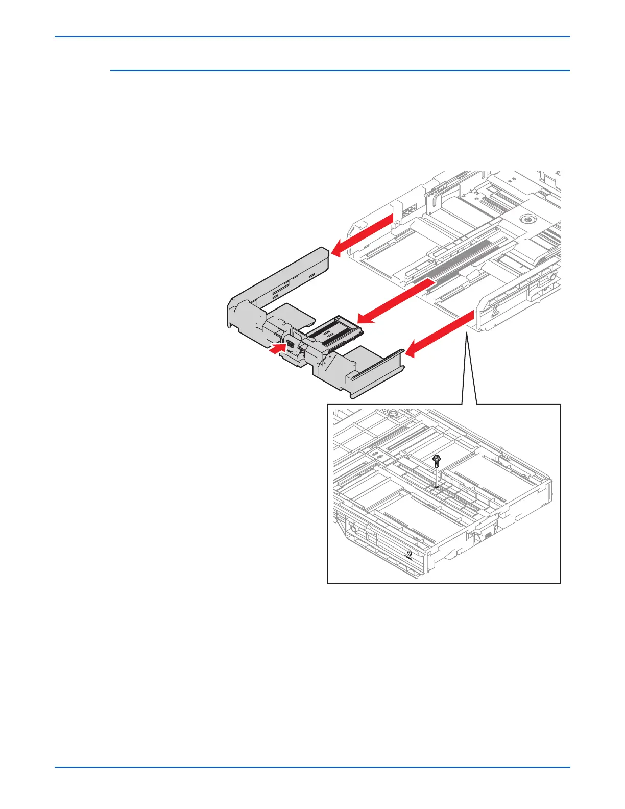 2. From the bottom side of Tray 2, remove 1 screw (8 mm, flanged) securing