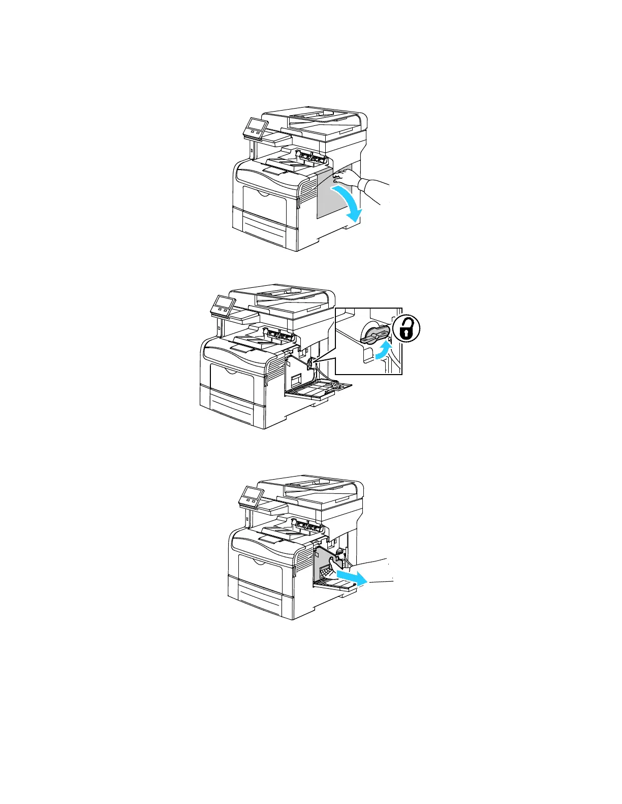 b. To unlock the waste cartridge, rotate the waste cartridge lever 90 degrees counterclockwise.