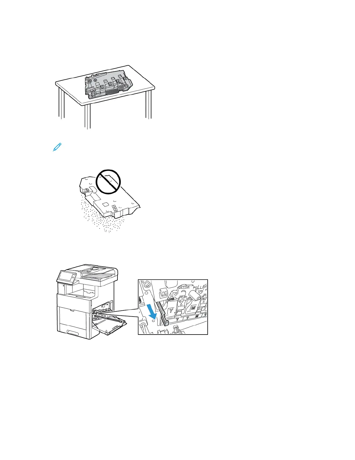 Note: To avoid toner spills or malfunction, do not lay the waste cartridge on its side, or with