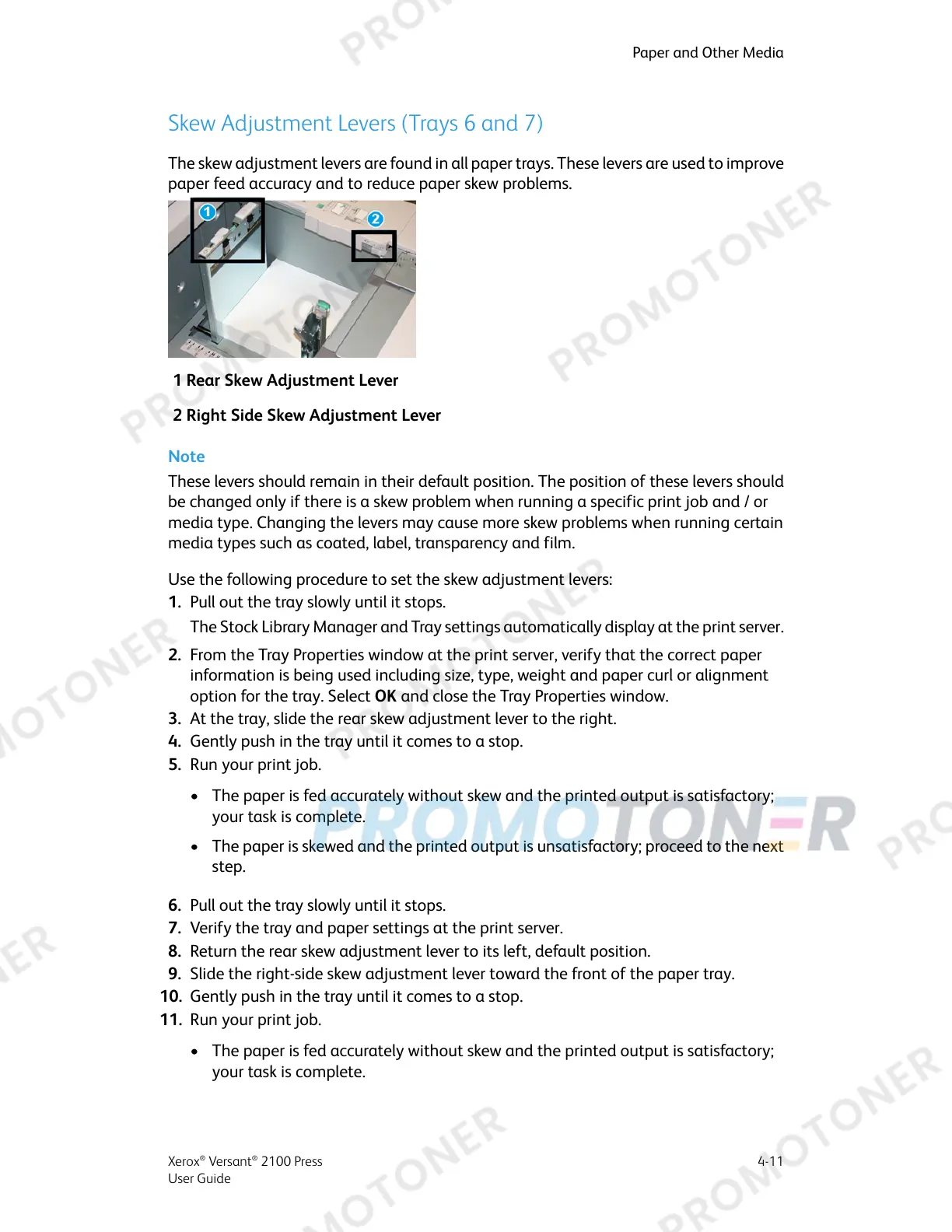 The skew adjustment levers are found in all paper trays. These levers are used to improve