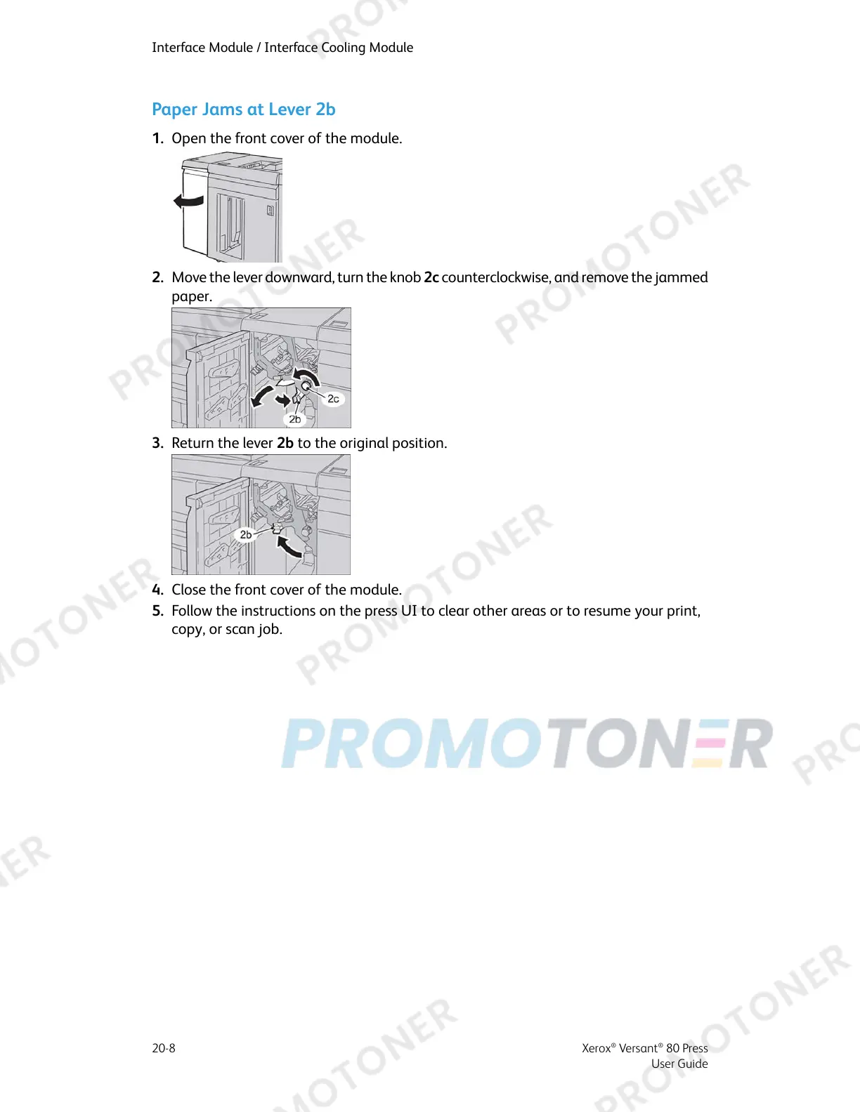 2. Move the lever downward, turn the knob 2c counterclockwise, and remove the jammed