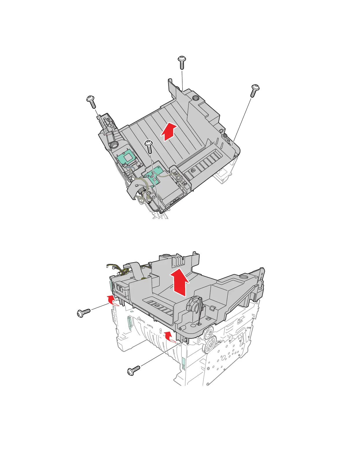 14. Remove 2 screws (silver, flanged, tap, 10 mm) on rear of printer, release the 2 hooks on the rear of