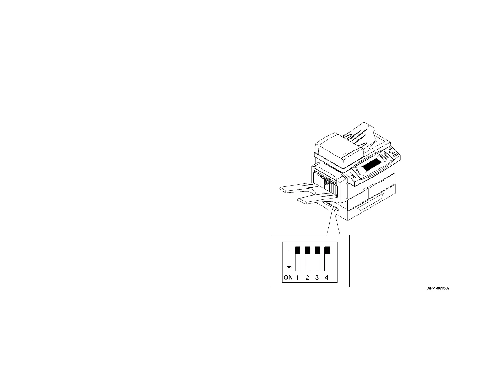 8. Check that the finisher PWB DIP switch settings are correct. Refer to the 12A Finisher