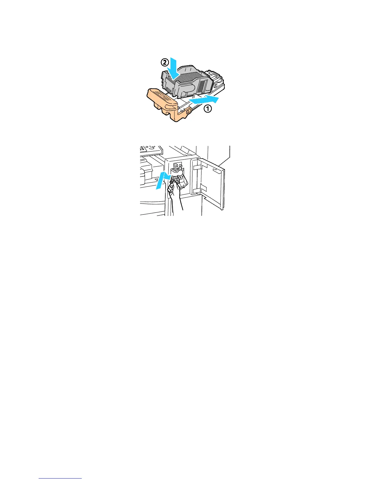 7. Insert the front side of the new staple case into the staple cartridge (1), then push the rear side into