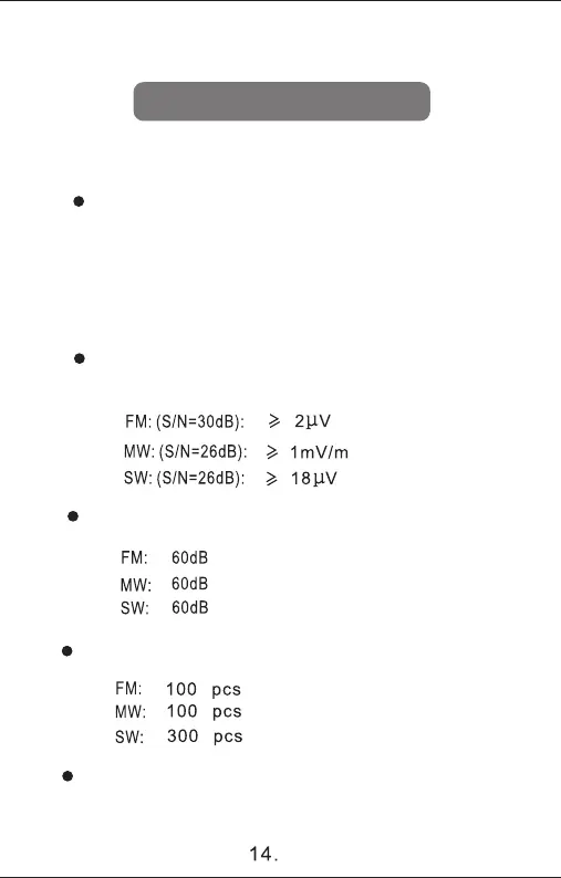 XHDATA D-608 - Technical Performance Specifications; Radio Frequency and Sensitivity Details; Radio Selectivity and Memory Capacity; Maximum Output Power