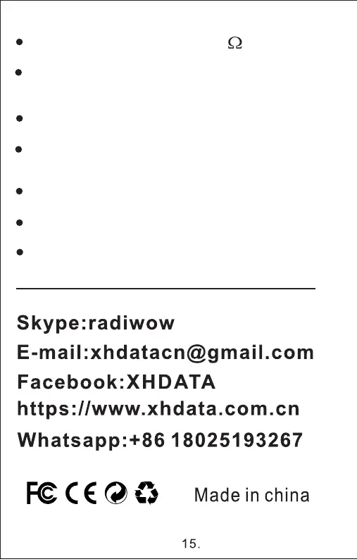 XHDATA D-608 - Detailed Specifications and Support; Audio, Connectivity, and Power Specifications; Contact Information and Certifications