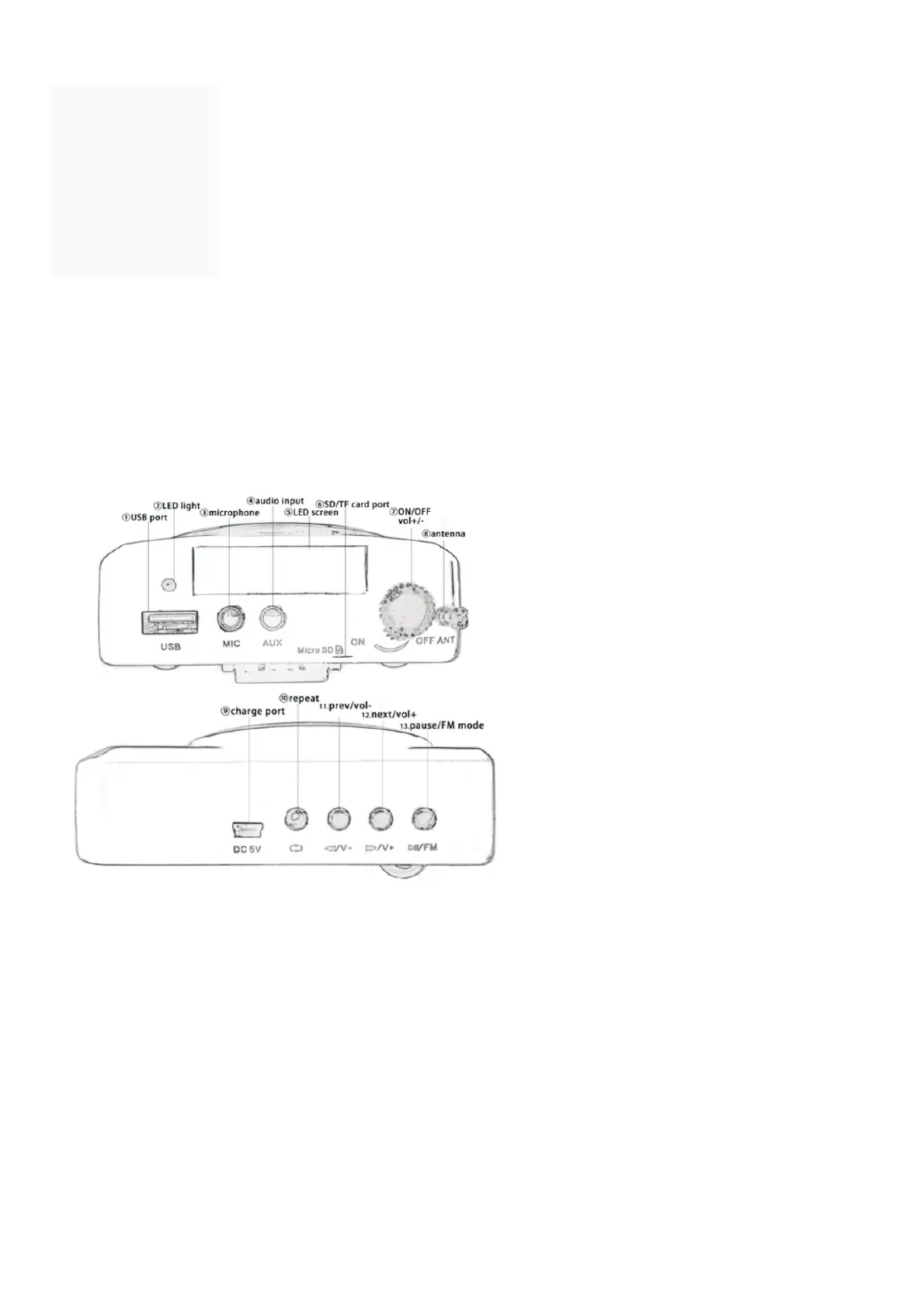 ⑩repeat: when play music or audio file, press repeat to repeat, LED show “ONE”/”ALL” means repeat one/all