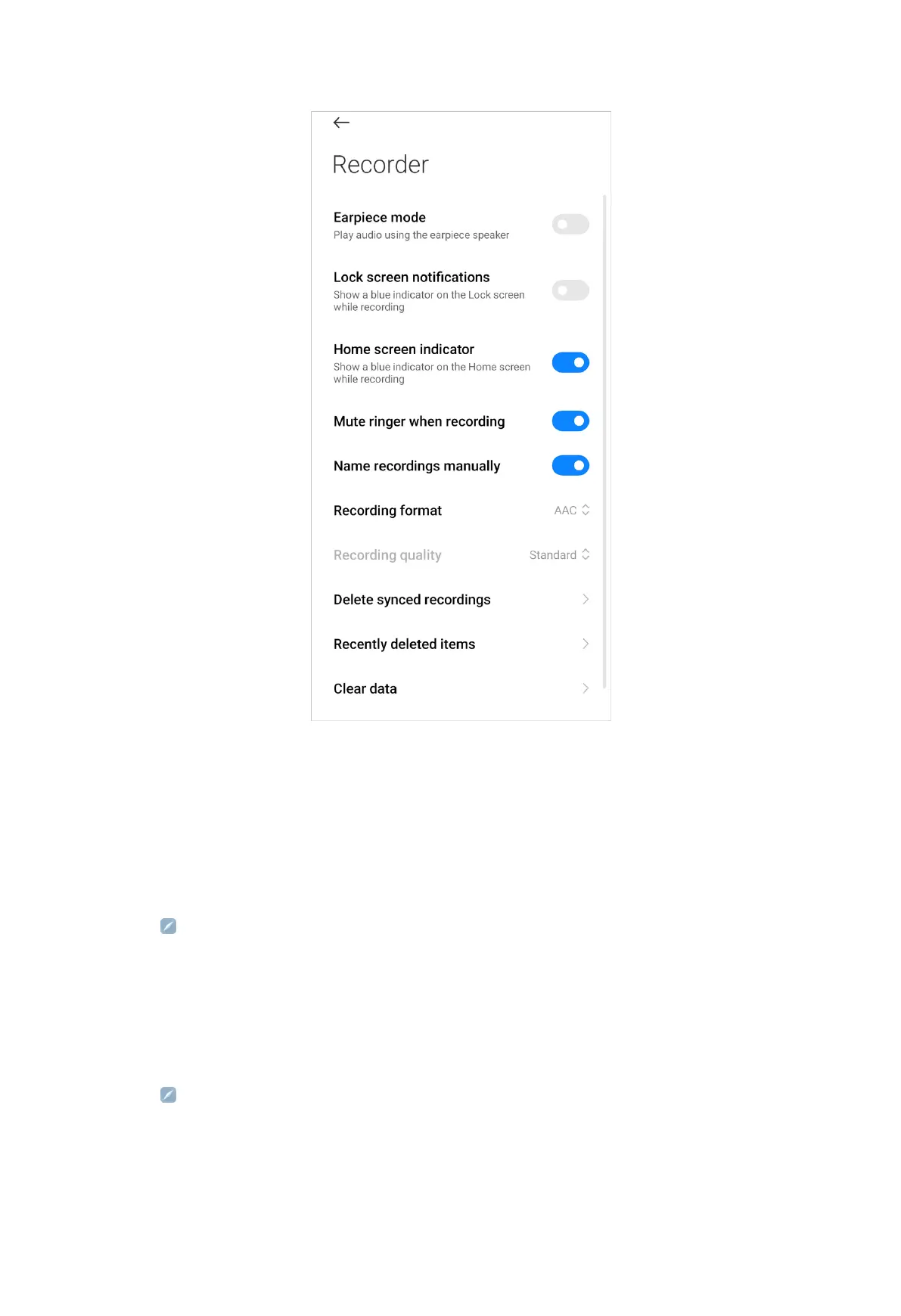 You can enable Earpiece mode, set the recording format, and do other settings