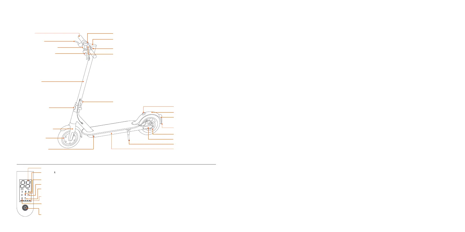 Кнопка питания. Нажмите кнопку один раз, чтобы включить самокат, и нажмите и удерживайте кнопку в течение 3 секунд, чтобы выключить