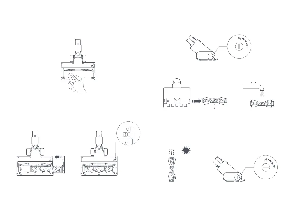 2. Wipe away excess dust and debris from the tangle-free brush bar, suction